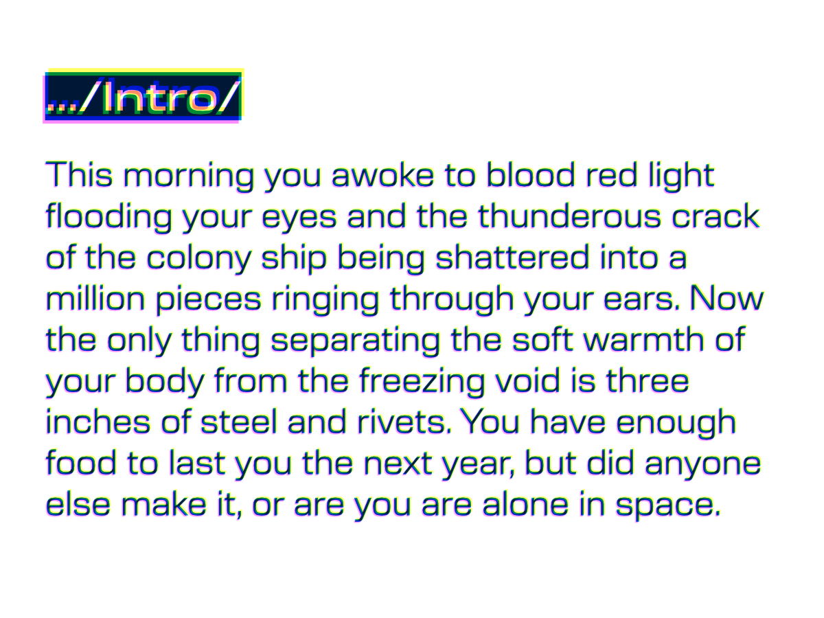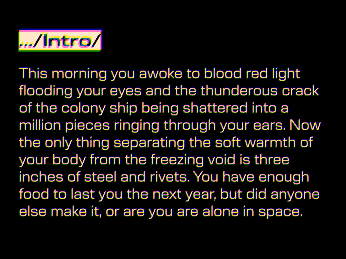 This morning you awoke to blood red light flooding your eyes and the thunderous crack of the colony ship being shattered into a million pieces ringing through your ears. Now the only thing separating the soft warmth of your body from the freezing void is three inches of steel and rivets. You have enough food to last you the next year, but did anyone else make it, or are you are alone in space.